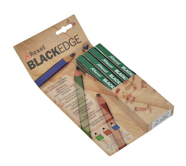 Blackedge Carpenter's Pencils have an oblong section which can be sharpened to a chisel shaped edge. This eliminates the tendency of a pointed pencil to follow the grain. Available in 3 grades: Green (hard): for hardwoods, brickwork and plastered walls.Red (medium): for general carpentry.Blue (soft): for softwoods and newly felled timber.