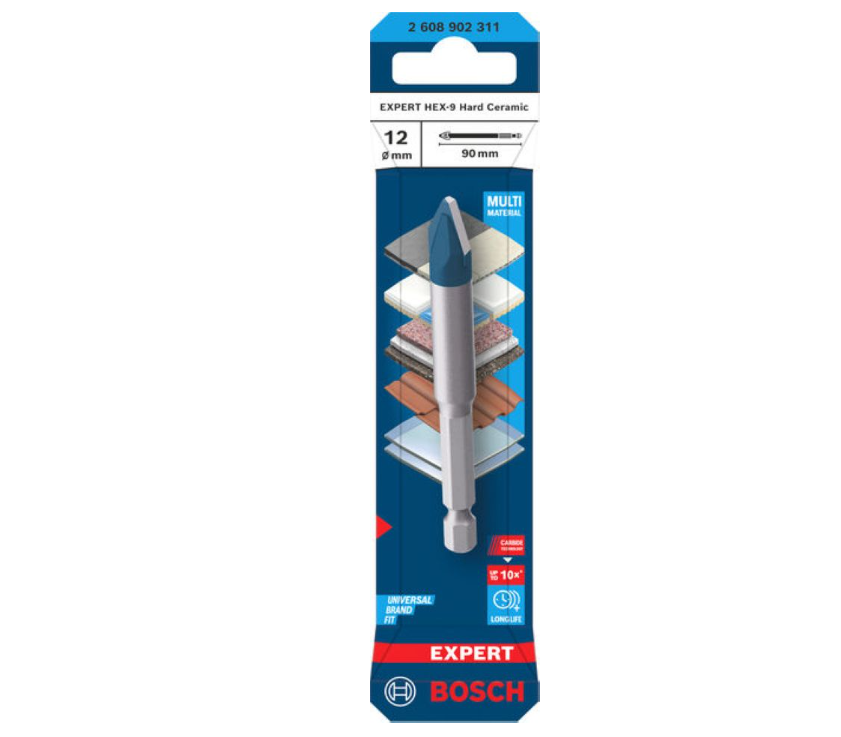Wall tiles have gotten bigger and harder. Therefore, drilling holes these days is a tough job for a tile drill bit. This is why Bosch has developed the EXPERT Hard Ceramic drill bit. This drill bit can drill dry into ceramic and lasts much longer than our standard tile drill bit.