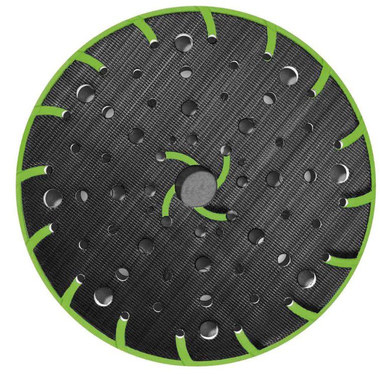 The Festool 202459 ST-STF D150/MJ2-M8-SW Sanding Pad delivers high material removal with maximum dust extraction. The patented MULTI-JETSTREAM 2 pad guarantees outstanding sanding results thanks to its unique functional principle. MULTI-JETSTREAM 2 is defined by the unique interaction between intake air and exhaust air – with optimum dust extraction right up to the edge. The result: Virtually 100% dust extraction for a consistently high material removal rate, top surface quality and a healthy working environment. A flow is generated between the intake air and exhaust air channels, similar to that which is produced when ventilating a room. The 48 suction holes collect the dust and transport it actively to the exhaust air channels. Dust is extracted from every point on the pad – right up to the edge – due to the ingenious arrangements of the channels. The fastener consists of high-temperature-resistant material and is therefore particularly durable. The special hooks in the fastener ensure perfect adhesion of the abrasive.
