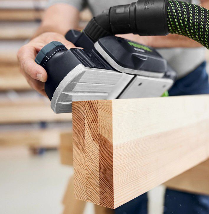 The Festool HLC 82 EB-Basic-Set 18V Cordless Planer is purpose-built for efficient and controlled material removal, giving you unmatched precision when renovating, restoring, or adjusting timber on site. Designed with a spiral blade for ultra-smooth results, this cordless planer easily tackles old coatings, glue residue, and uneven surfaces. Whether you're working on windows, doors, beams or furniture, the HLC 82 delivers consistent, even finishes with minimal effort. The wide 82mm planing width paired with an adjustable depth setting makes it perfect for levelling wood, smoothing edges, and creating flush joints. With a maximum cutting depth of 3mm and a maximum rebating depth of 25mm, it’s well-equipped for both surface and joint tasks. Its compact, well-balanced body allows for effortless single-handed operation—even overhead or in tight corners. Compatible with Festool’s full range of HK 82 interchangeable heads, you can switch between different profiles or textures in seconds with no extra tools required. The efficient brushless EC-TEC motor maximises runtime from any Festool 18V battery, giving you cordless freedom without sacrificing power or control. Dust extraction ports on both sides ensure flexible, dust-free work when connected to an extractor, keeping your workspace clean and your visibility clear.