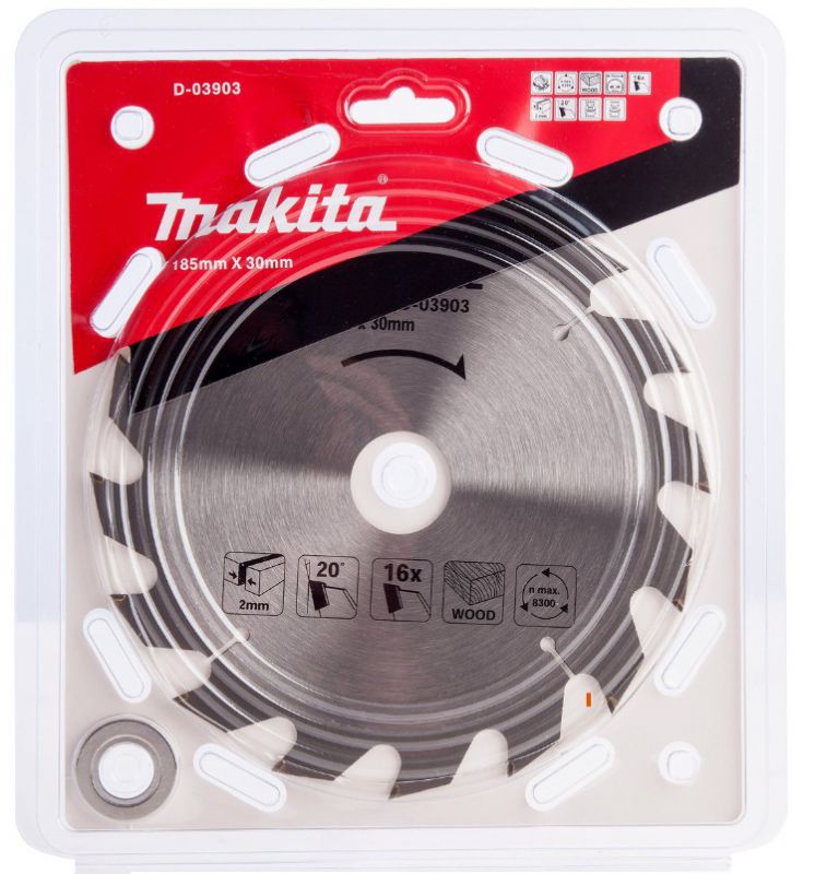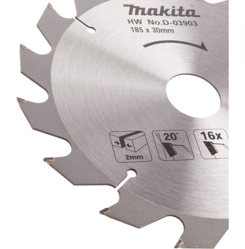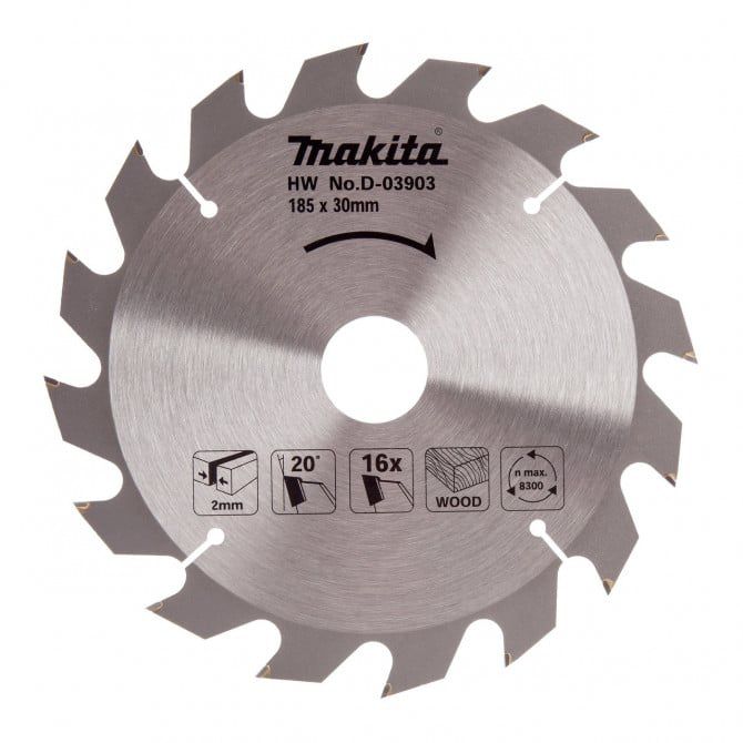 The Makita D-03903 is a Standard Blade for a Portable Saw. It has a Diameter of 185mm with a tooth count of 16, suited to faster cutting with a rough finish.