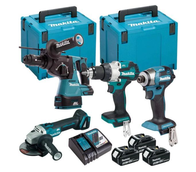 The Makita DLX4195JX1 18V Cordless 4 Piece Kit provides a complete professional setup for drilling, cutting, grinding, and fixing applications. It includes four premium LXT brushless tools — a combi drill, angle grinder, rotary hammer, and impact driver — along with three 5.0Ah batteries, a fast charger, a 5-piece SDS-Plus drill set, three diamond cutting wheels, and two durable Makpac stacking cases for organised storage and transport. This powerful, versatile kit is ideal for trade professionals who demand performance, reliability, and convenience on site.