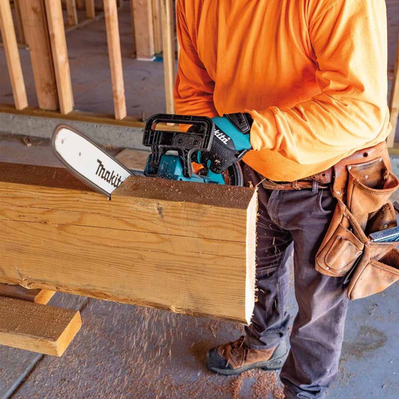 The Makita DUC357Z 18V Li-ion LXT Brushless 350mm Chainsaw is a powerful, efficient tool designed for cutting wood. It features a maintenance-free brushless motor for long life and a battery protection circuit to prevent overloading, over-discharging, and overheating. The chainsaw operates at a maximum chain speed of 7.7 m/s and has a 350 mm (14") chain bar length. It includes a chain oil tank with a capacity of 0.15 L. With a sound power level of 97 dB(A) and a weight of 2.9 kg (without battery), it is both powerful and lightweight. The package includes a guide bar, chain protection cover, and saw chain, but does not include the battery.