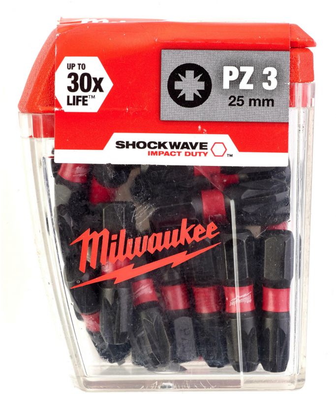 Designed for use with impact drivers the Shockwave Impact Duty screwdriver bits are not only ideal for heavy duty impact applications, but also deliver a full system solution for all the user's drilling and fastening needs. Shock Zone geometry is designed to flex reducing stress at the tip resulting in less tip breakages. The combination of the Shock Zone design and special heat treatment absorbs impacts and allows the bit to flex with spring like action. Compression forged tip provides the best fit with screw head, reducing cam out and stripping, resulting in outstanding lifetime. Manufactured from custom engineered steel, Milwaukee custom metal formula makes the Shockwave bits more resistant to shock from impacting.
