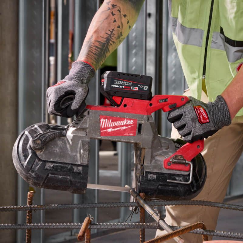 The Milwaukee 4932492131 M18 FB8 FORGE 18V 8.0Ah Battery Pack is a high-performance battery designed for demanding applications. It delivers the power equivalent to a 12.0Ah battery while being 30% smaller and 20% lighter, making it more portable and easier to use. The battery features the REDLITHIUM FORGE technology, which offers maximum power, the fastest charging times, and the longest lifespan among REDLITHIUM batteries. It has an active COOL-CYCL system for rapid cooling, reducing downtime, and is housed in a durable, oil, solvent, and grease-resistant casing. Additionally, the battery is equipped with an enhanced onboard fuel gauge visible even in direct sunlight and features REDLINK intelligence for optimized performance and protection. It is compatible with all M18 tools and can be charged to 80% in just 35 minutes using the M18 dual bay super charger.