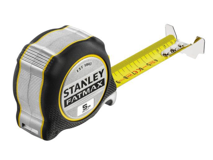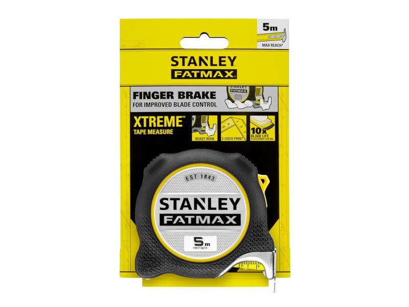 The STANLEY FATMAX XTREME Tape Measure is engineered for a multitude of professional applications, delivering precise measuring performance. The clearly-defined, double-sided black print on yellow tape enables high visibility and precise vertical and overhead measuring. Equipped with a robust, oversized Beast Hook, users will find this tape achieves an excellent grab on materials of all types. For trade pros working alone, each tape offers a long, straight and strong 5m maximum reach, ensuring optimum efficiency. It also features 16cm of BladeArmor coating for outstanding hook connection, added strength, and resilience against abrasion and wear on the jobsite. An integrated finger brake provides ultimate blade control, improved blade retraction and enhanced ergonomics.