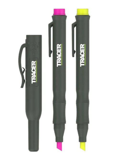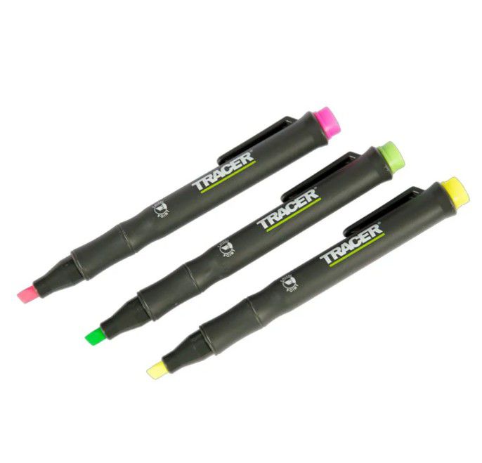 The Tracer AFH-MK3 3 Piece Fluorescent Highlighter Kit is a selection of brightly coloured highlighting markers that are ideal for making amendments to documents or plans. The yellow, green and pink highlighters include durable site holders that allow a secure grip in your pocket or trousers. Each one features a 1-5mm angled chisel nib which is made from a durable acrylic. Suitable for working on paper and carboard.
