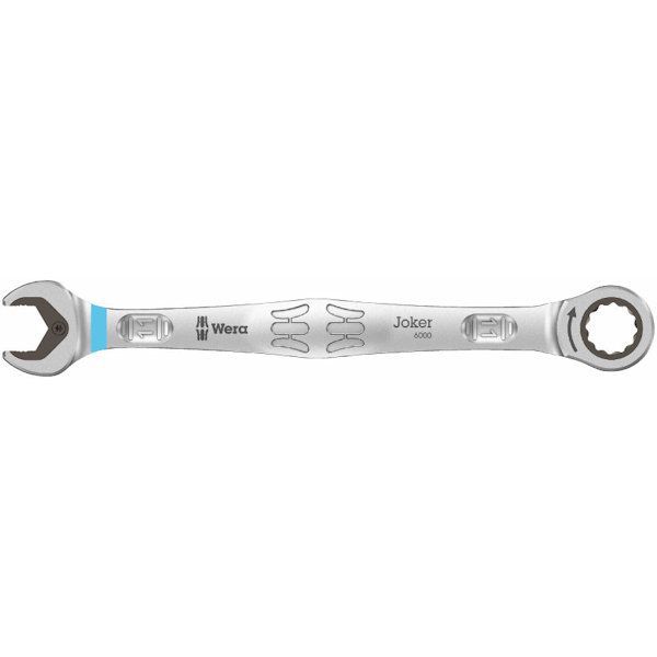 Premium metric ring ratchet spanner by Wera: Everything a wrench can do and so much more. Faster, better, more beautiful. A real Joker! The new generation of ring ratchet spanners. For hexagon screw heads and bolts. With holding function enabled by a metal plate in the open end, which reduces the risk of losing screws and sockets. With its extra hard teeth the exchangeable metal plate in the open end secures screws and sockets and reduces the risk of slipping. The integrated end stop can prevent the screw head from slipping down and allows application of high torques. The double hexagon geometry ensures a positive connection with the screw or bolt and thus reduces the risk of slipping. A return angle of only 30° at the open end side avoids time-consuming rotating of the wrench whilst screwdriving. Ratchet mechanism at the ring side with exceptionally high fine toothing of 80 teeth for flexibility even in confined spaces. The specially engineered geometry allows a high torque transmission and high bending stiffness. Made of high-performance chromium molybdenum steel with nickel-chromium coating for high corrosion protection.